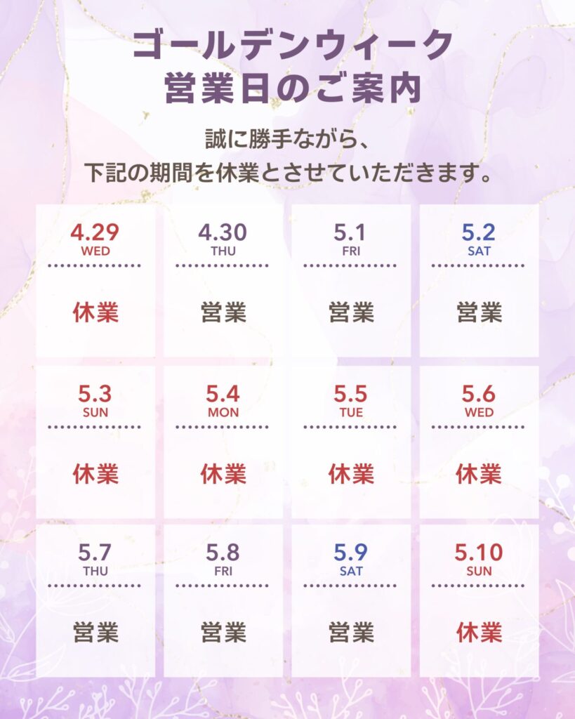 誠に勝手ではございますが、2026年5月3日(日)より2025年5月6日(水)まで、ゴールデンウィーク休業とさせていただきます。