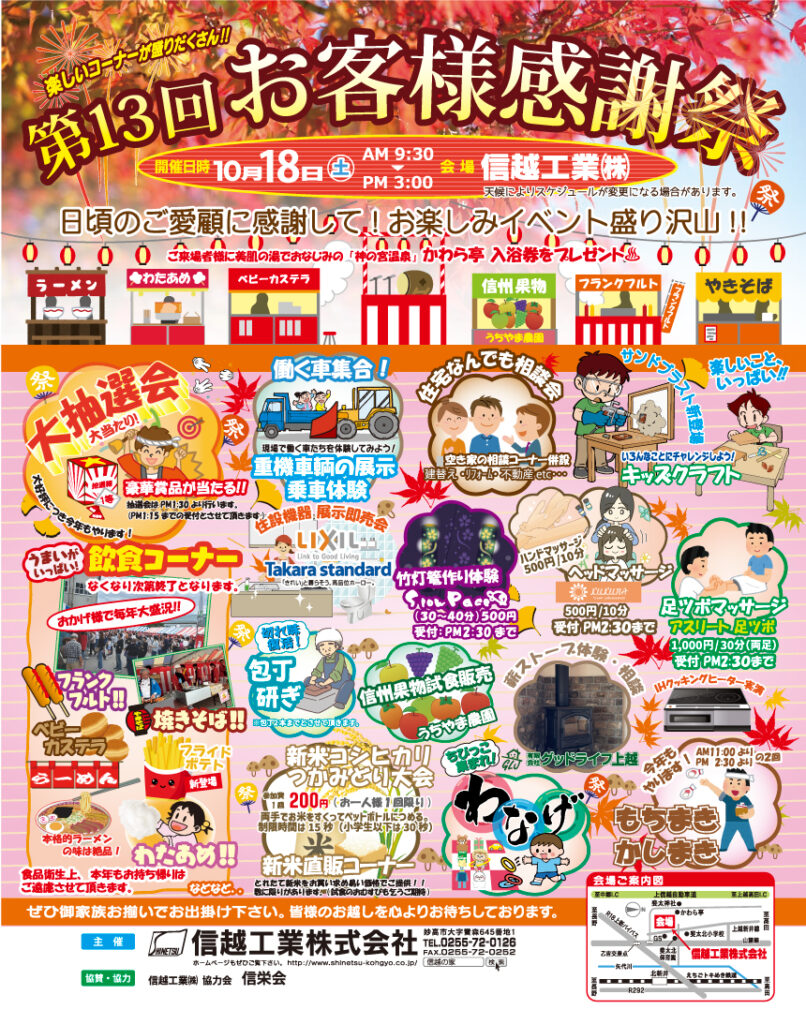 日頃のご愛顧に感謝して、今年も下記の通り「お客様感謝祭」を実施致します。開催日時:10月18日(土)9:30~15:00会 場:信越工業株式会社対 象:当社お客様(当日は、お配りしております「ご招待券」を必ずお持ち下さい)